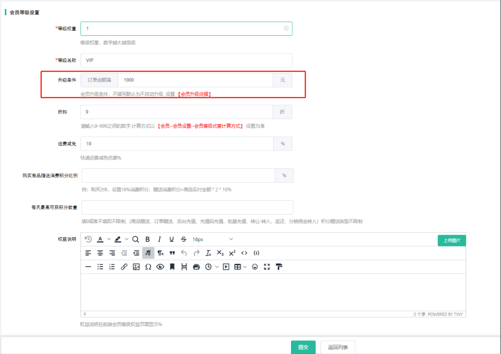 增加会员的奖励,设置不同的会员等级,享有不同的购物折扣以及用于权限设置。注意:会员等级默认订单完成后才能升级。