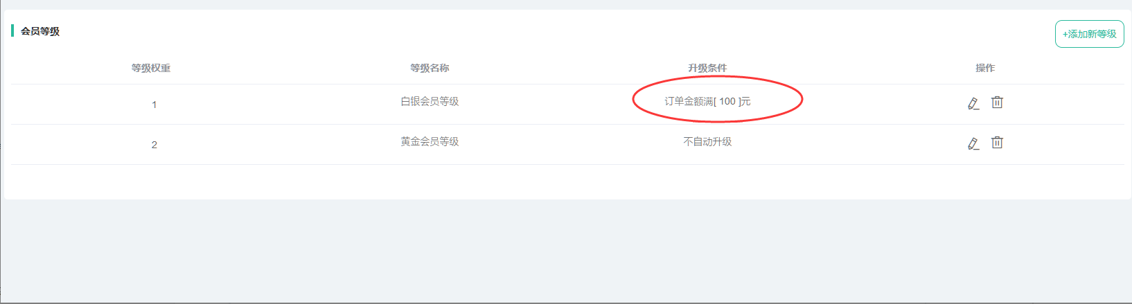 在“会员管理——会员等级”添加等级时,假设升级条件是已完成的订单满额,设置好后会员达到了设置的满额(完成收货后的金额)即可自动升级。