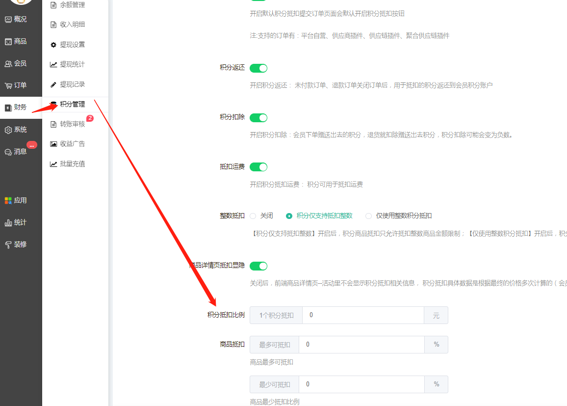 **如果选择转入积分,必须到财务--积分管理--基础设置--积分抵扣设置--设置积分抵扣比例,不然分销结算佣金不会自动转入会员积分