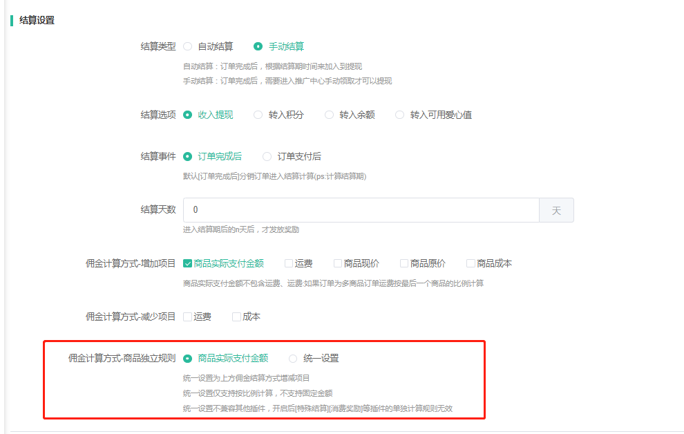 选择统一设置则是按照佣金计算方式选择的增加项目和减少项目去进行计算,仅支持按比例计算~