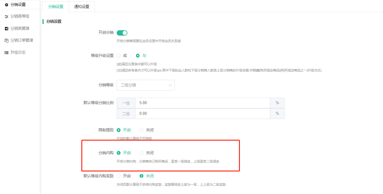 开启分销内购,分销商自己购买商品,享受一级佣金,上级享受二级佣金