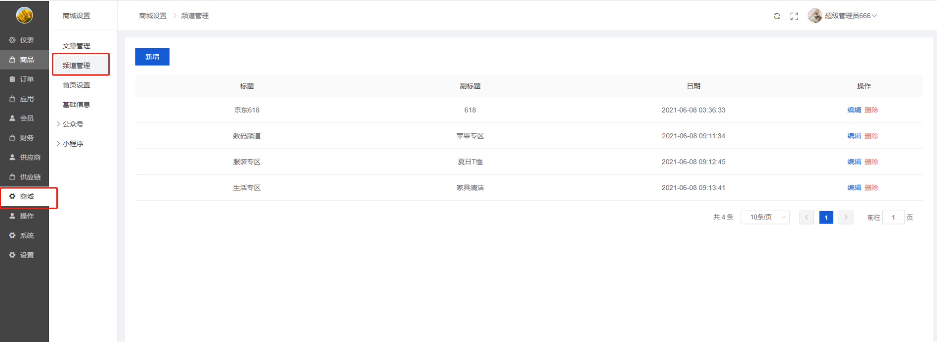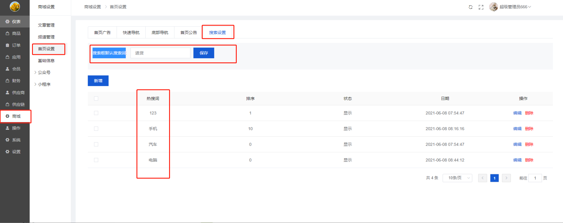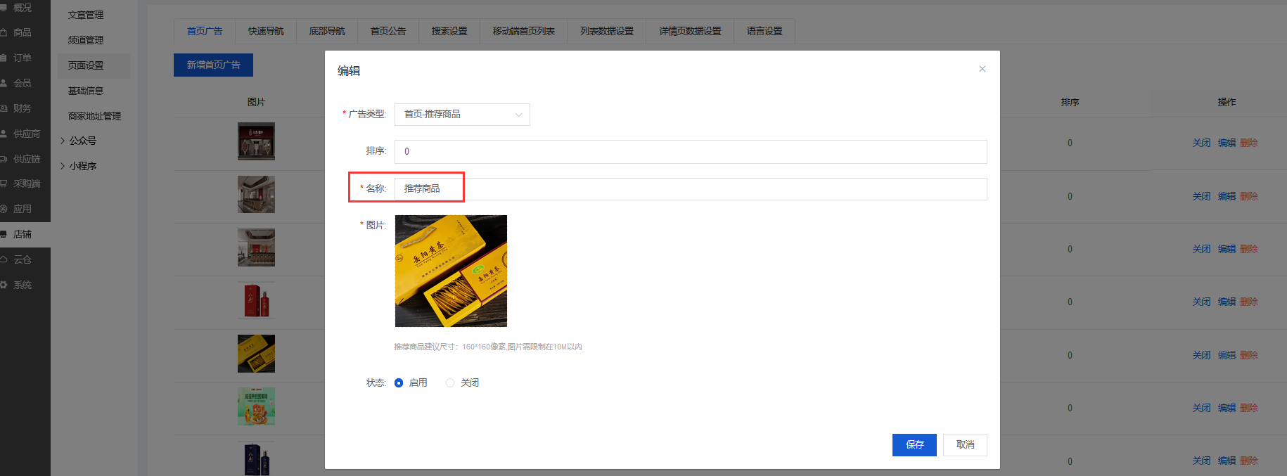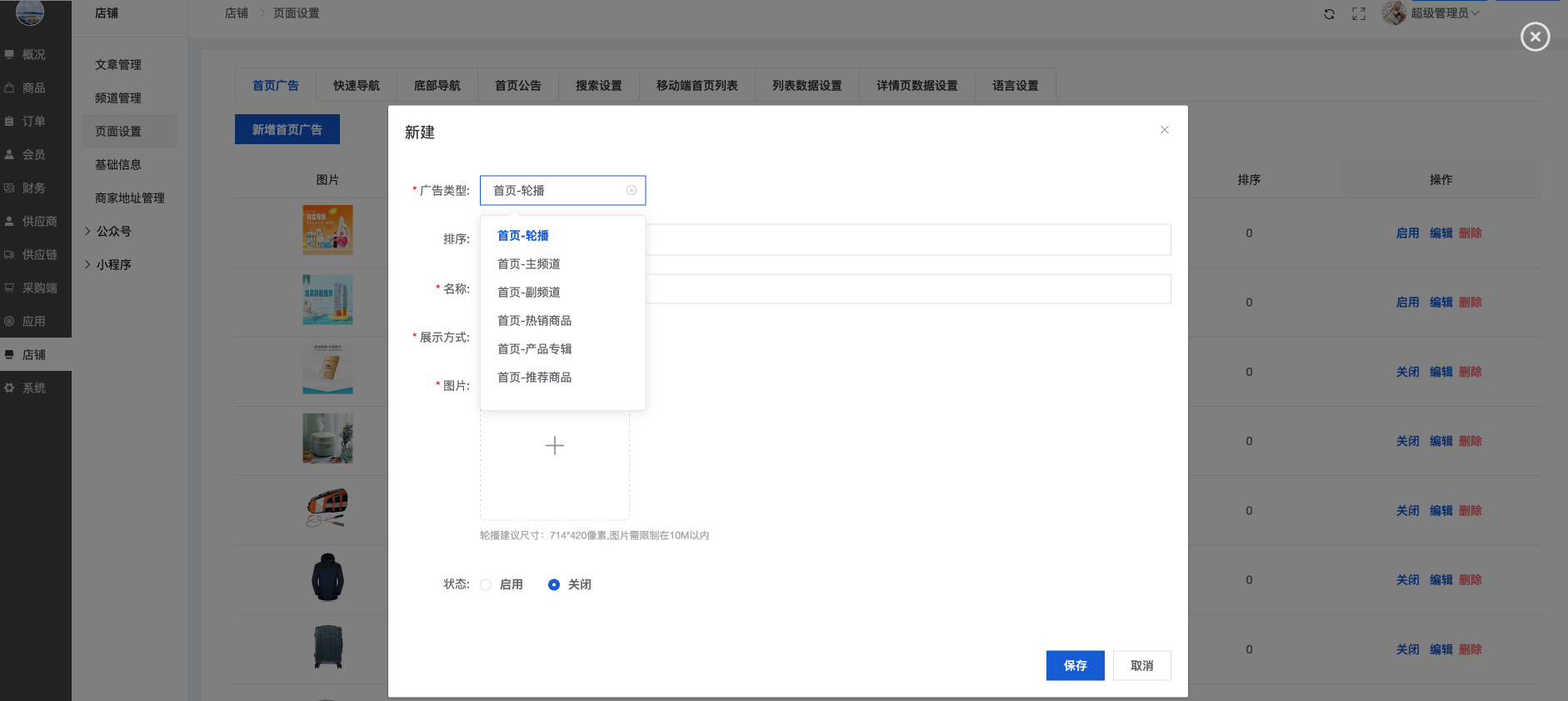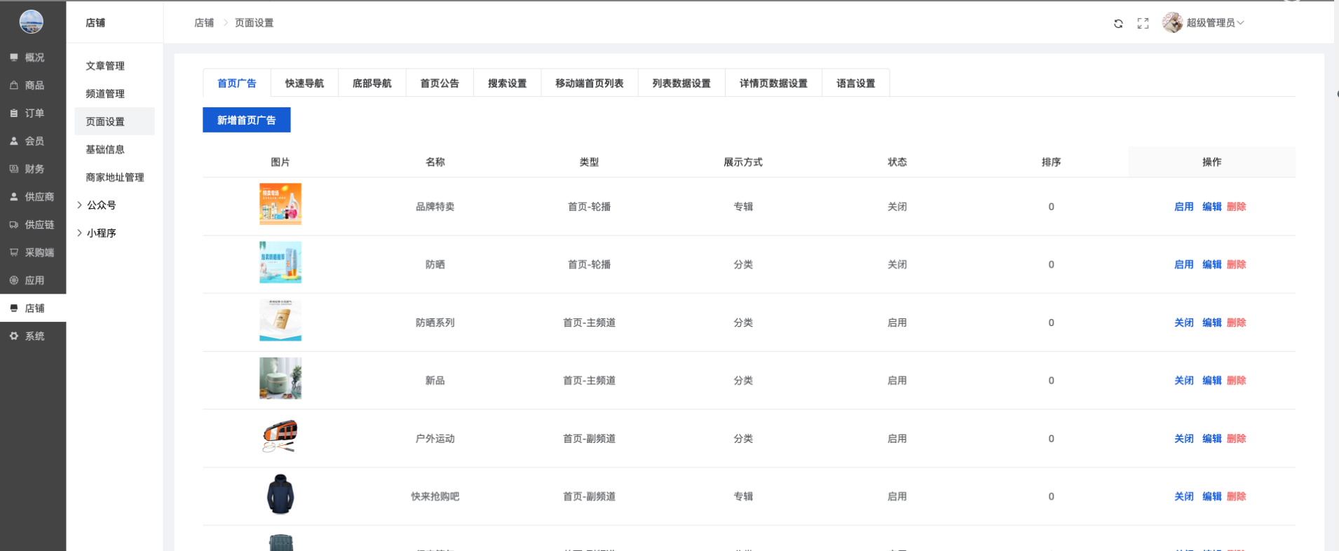 可以新增/编辑首页广告、关闭/开启/删除首页广告(前端只显示开启的首页广告)