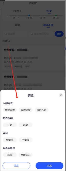 *筛选:入群方式、是否在群、新老会员、是否粉丝