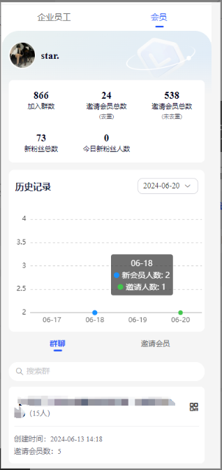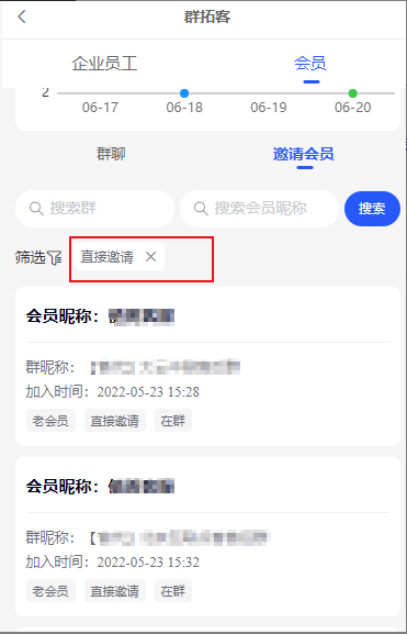 3)邀请人会员,只有通过群拓客二维码邀请的,才能获取到邀请会员,直接拉人进群是没有的.
