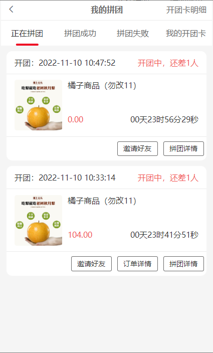 2, 正在拼团:还未拼成功的团,状态处团长显示开团中,拼团会员显示拼团中,开团卡开的团没有订单详情按钮