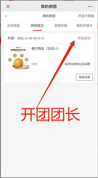 4, 拼团成功:状态处团长显示开团成功,拼团会员显示拼团成功