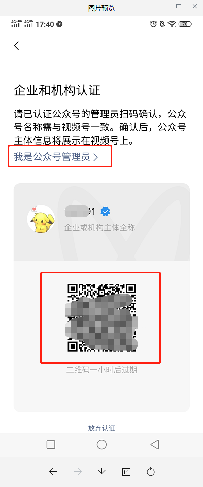 创作者中心-认证-企业和机构认证-我是公众号管理员-或让管理员扫码