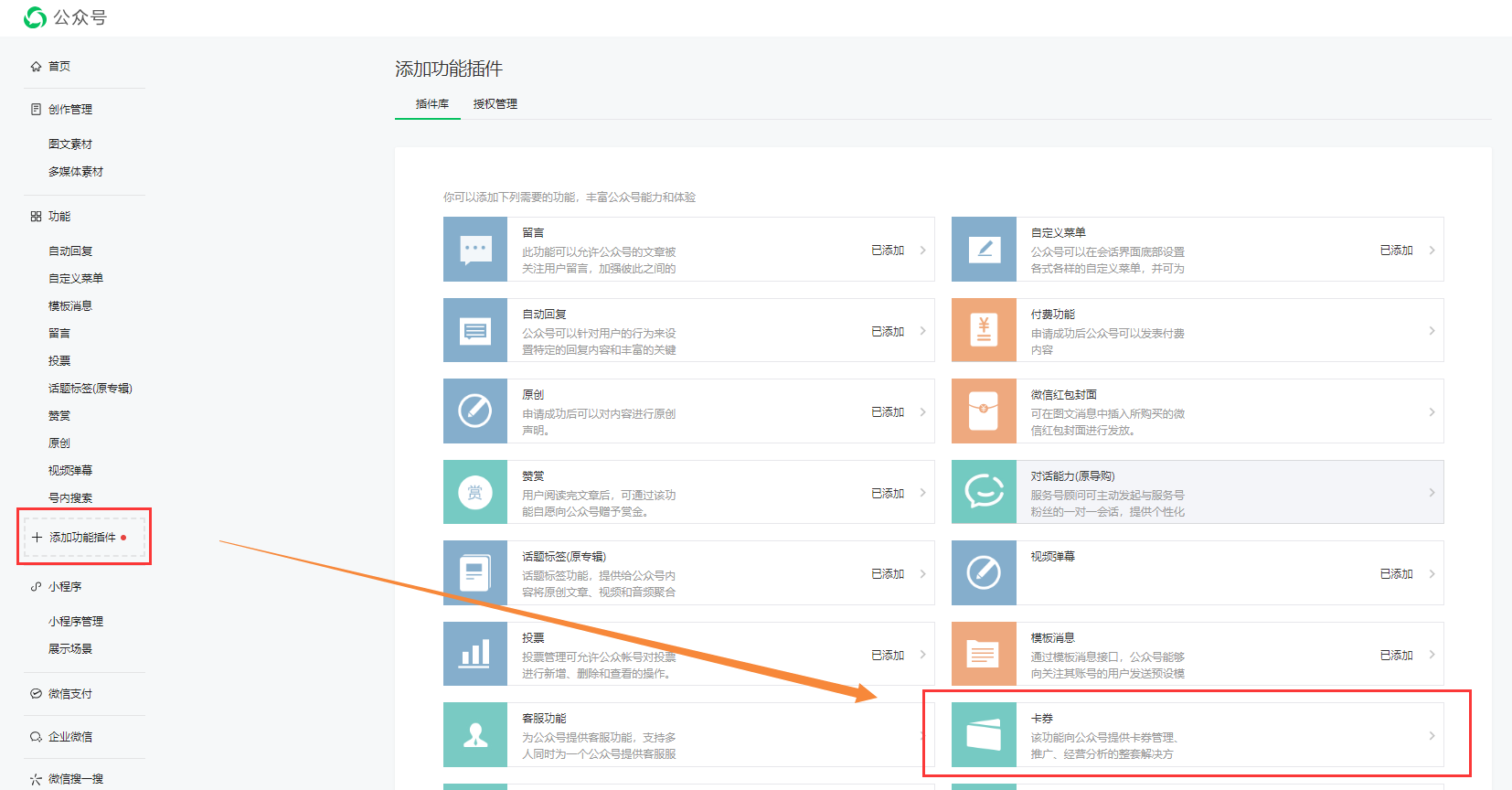 2、登录公众号平台mp.weixin.qq.com,【功能】-【添加功能插件】-【卡券功能】,开启卡券功能,选择“我是普通商户”