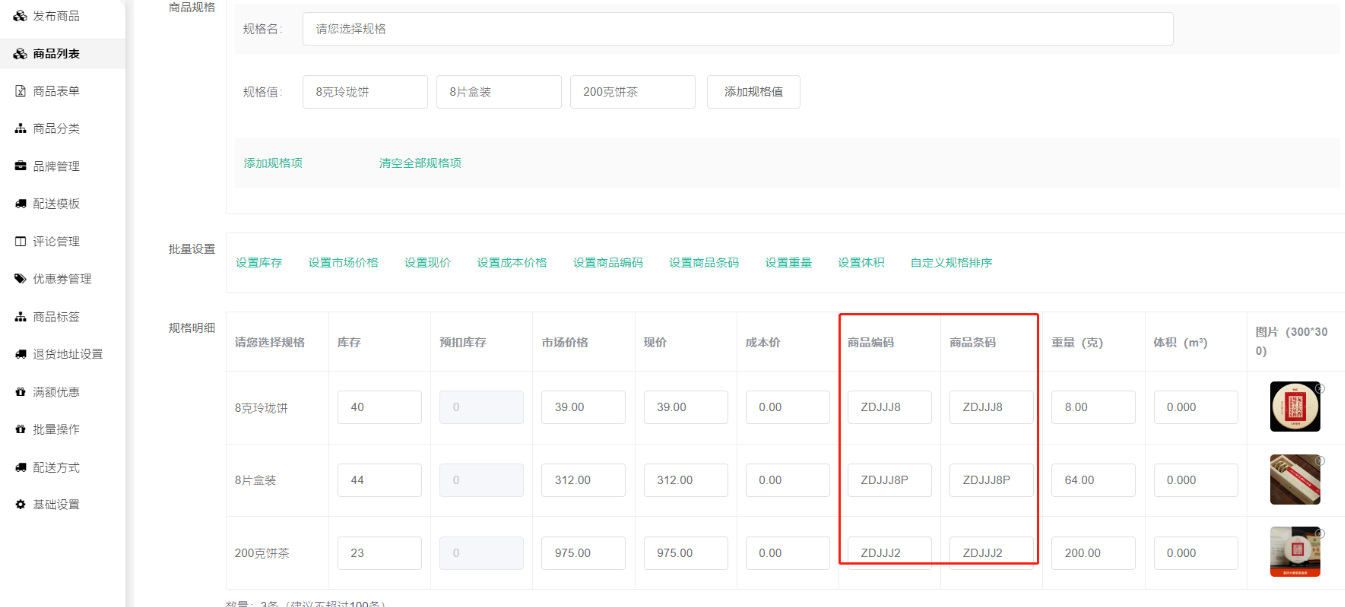 多规格商品,基本信息处的商品编码条码需要填写外,同时规格里面的商品编码、商品条码也需要填写,两者缺一不可,如果只是填写其中一项,会导致推送不全从而导致后续的异常