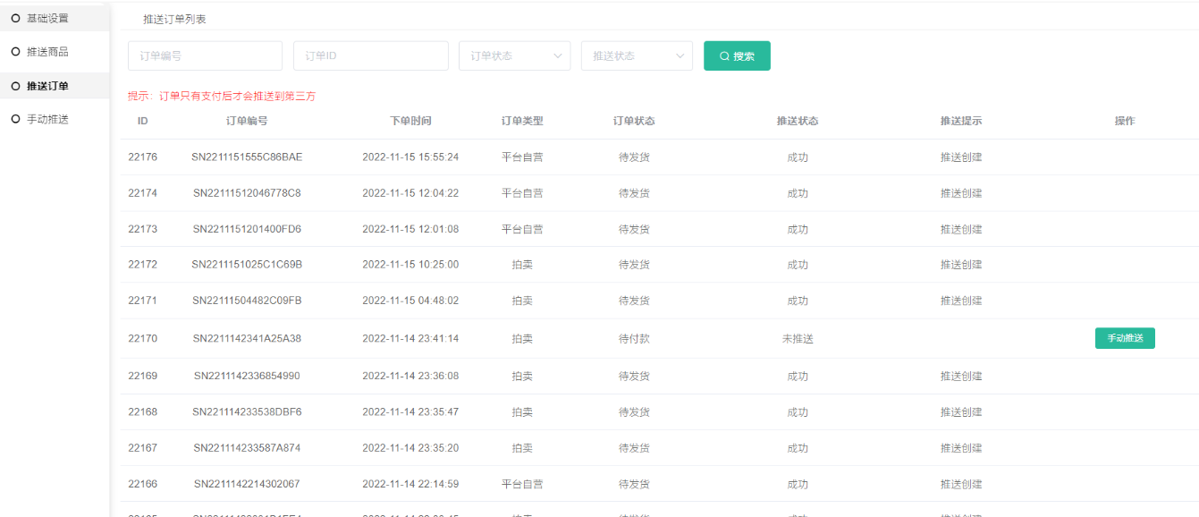需要注意:只有订单支付了才能推送到第三方,如果订单未支付就推送在第三方那边是没有记录的,推送订单列表这里只是记录哪些订单跟第三方有关联商城的订单,操作发货/收货等还是需要到对应的订单列表(比如平台订单或者是拼团订单列表等)