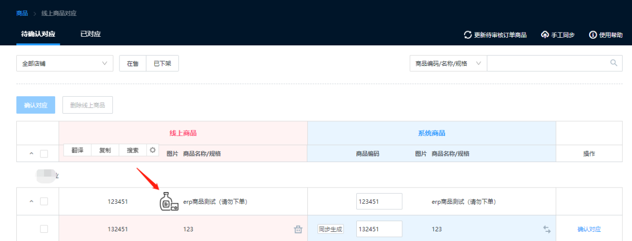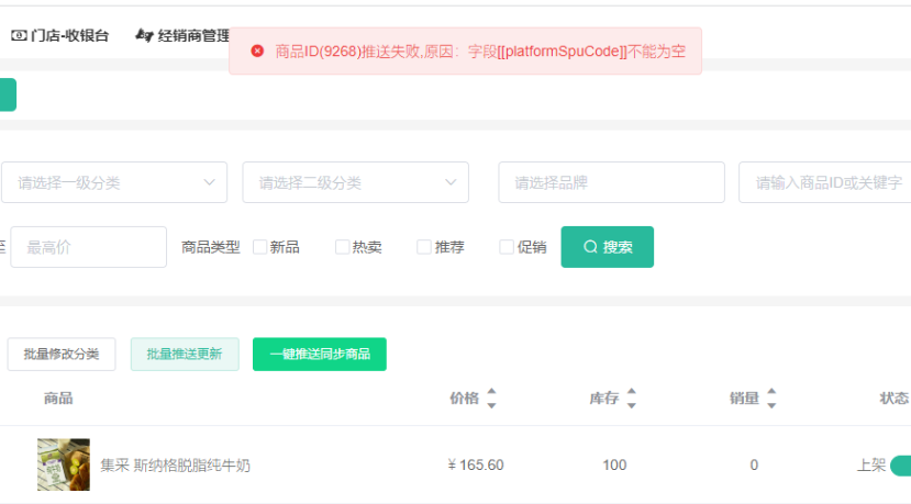 手动推送订单,提示:商品未同步无法推送