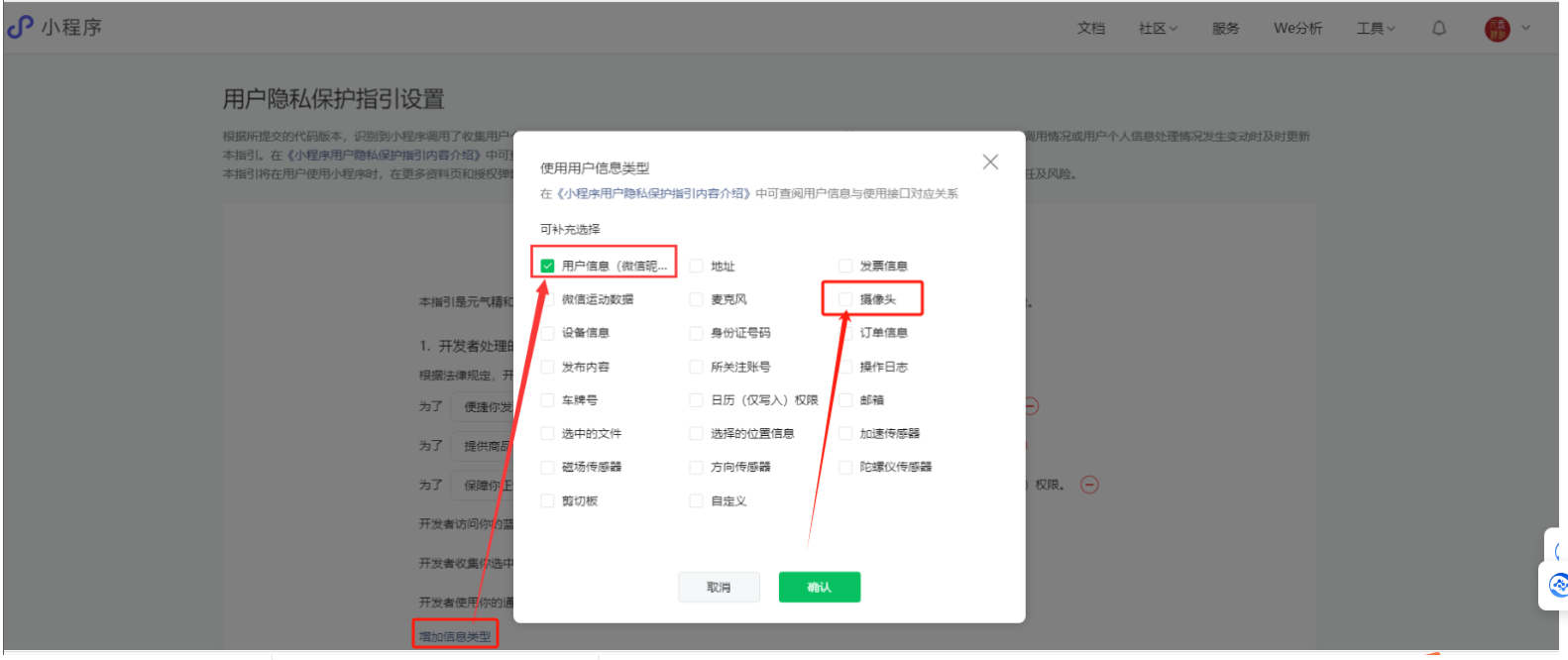 必须要增加的选项为:用户信息(微信昵称)、摄像头