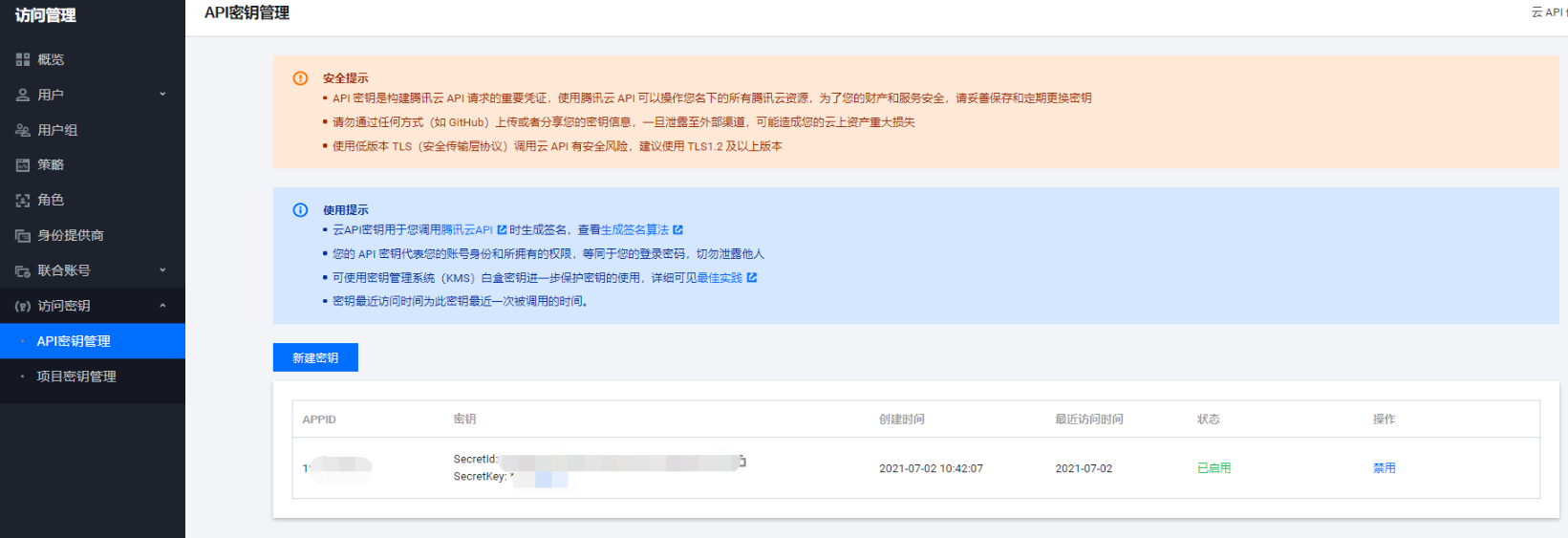 4、点击访问管理--访问密钥--访问API密钥,获取appid、SecretId、SecretKey,粘贴到后台腾讯云语音合成配置处即可
