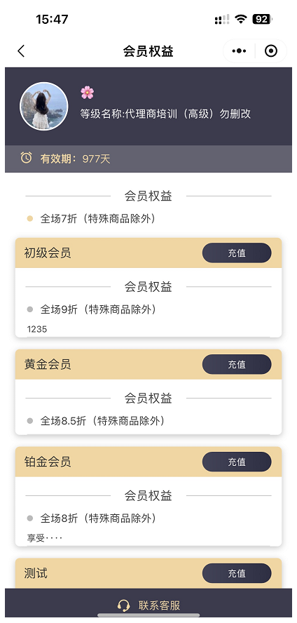 会员等级处设置好对应的会员等级,与会员等级设置的一次性充值余额升级的等级不冲突,满足哪个条件就升级哪个,只是开启会员等级升级(充值余额)后,会员余额为0时等级失效,会变为普通会员等级,建议设置一致,不然容易混淆