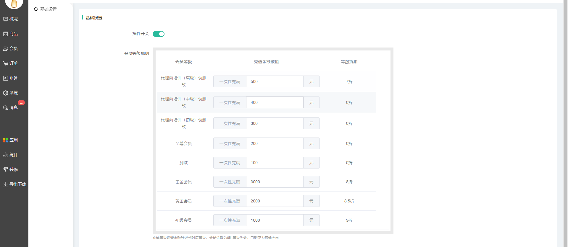 一、安装启用插件,设置升级等级所需充值的余额数量,设置后会员在前端充值余额时会升级到对应等级,会员余额为0时等级失效,变为普通会员等级