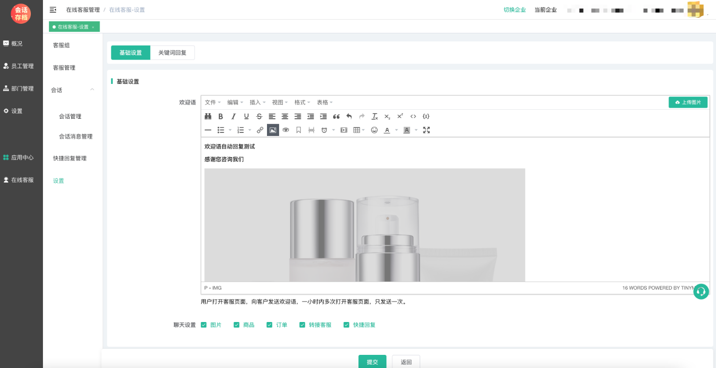支持编辑器图文设置,设置后,用户在前端发起客服咨询,自动回复欢迎语。