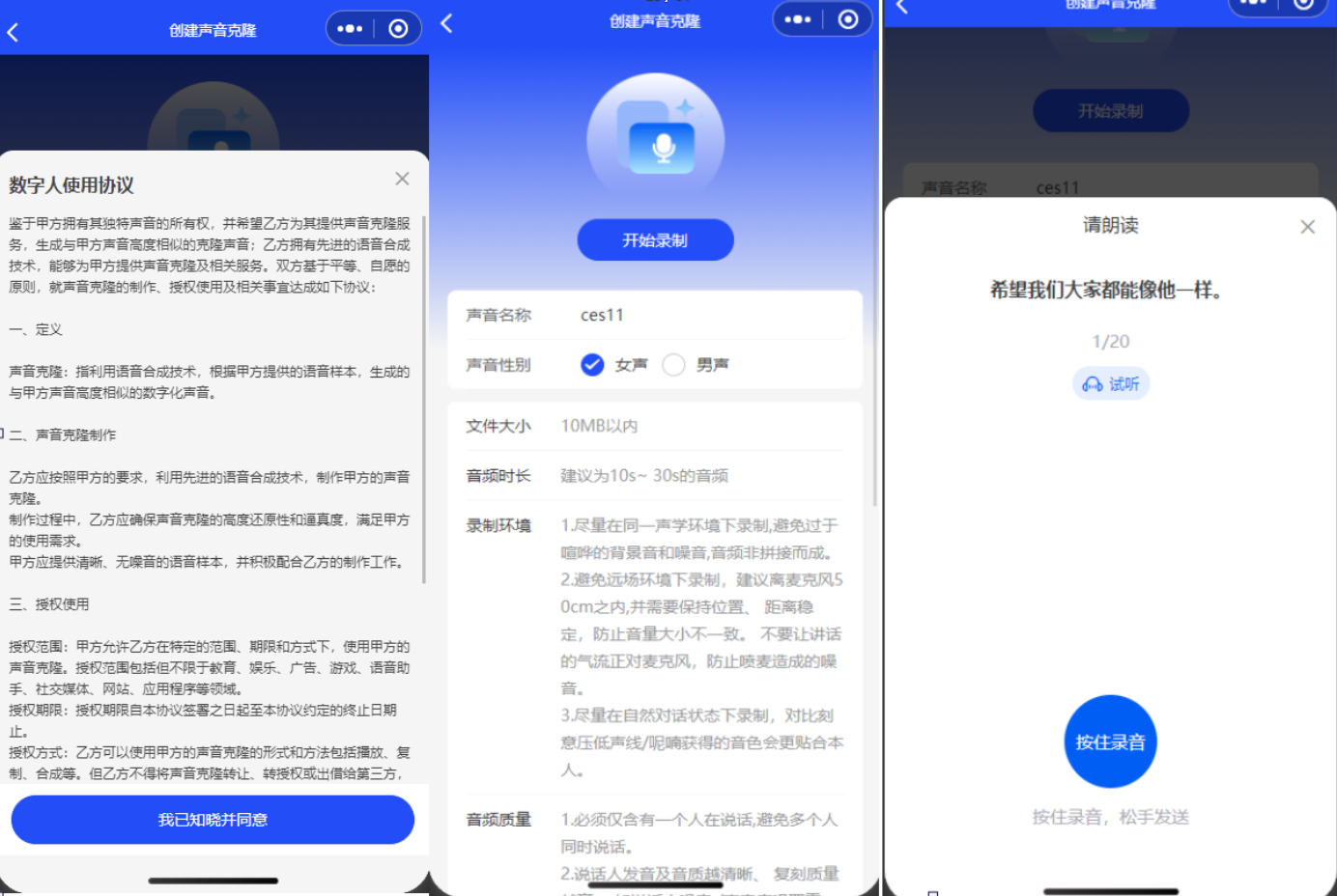 声音克隆协议内容:设置前端创建声音克隆时的弹窗内容