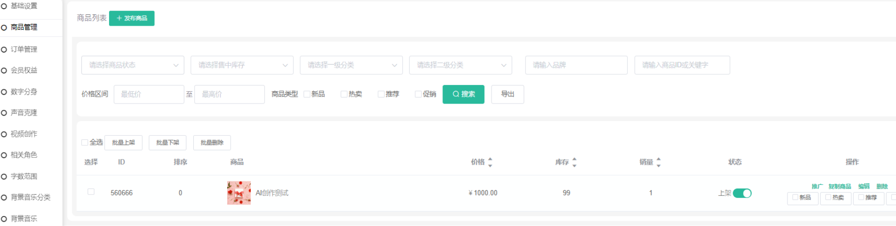 展示已创建 AI创作权益套餐自营商品